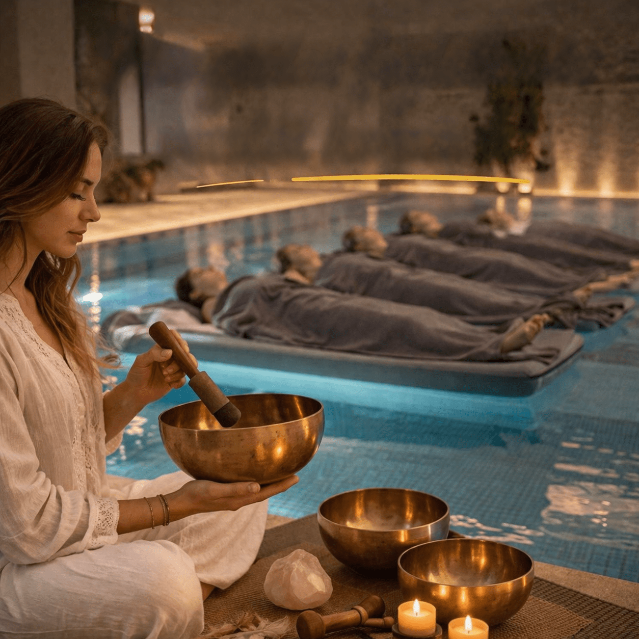 Ez egy különleges, vízen zajló relaxációs élmény, ahol matracon lebegve, teljes biztonságban pihenhetsz, miközben hangtálak rezgései segítenek ellazulni és lecsendesedni.